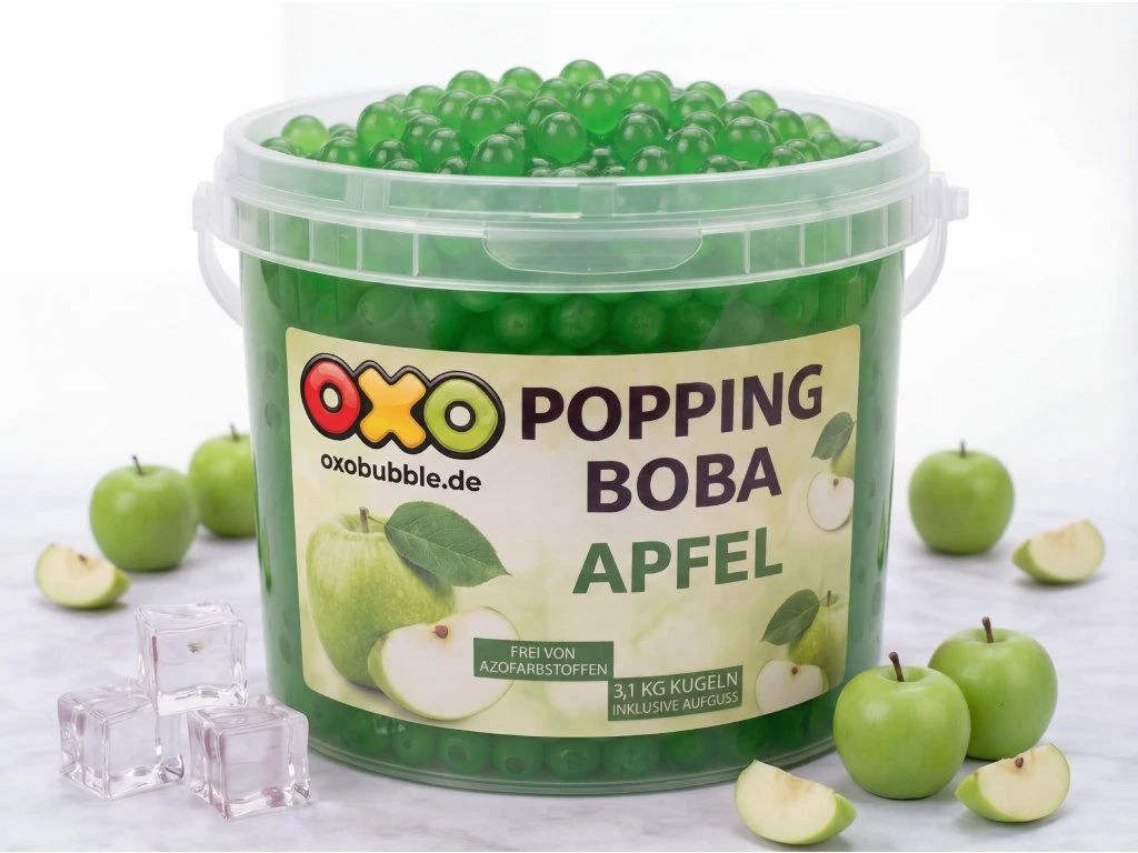 Apfel Popping Boba OXO bieten einen frischen, leicht süß-sauren Apfelgeschmack und ein ausgeprägtes Aroma, das jedes Bubble Tea Getränk perfekt bereichert.