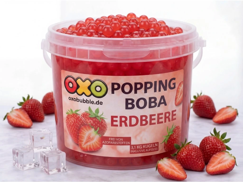Erdbeer Popping Boba OXO bieten einen süßen, saftigen Erdbeergeschmack und ein ausgeprägtes Aroma, das jedes Bubble Tea Getränk perfekt ergänzt.